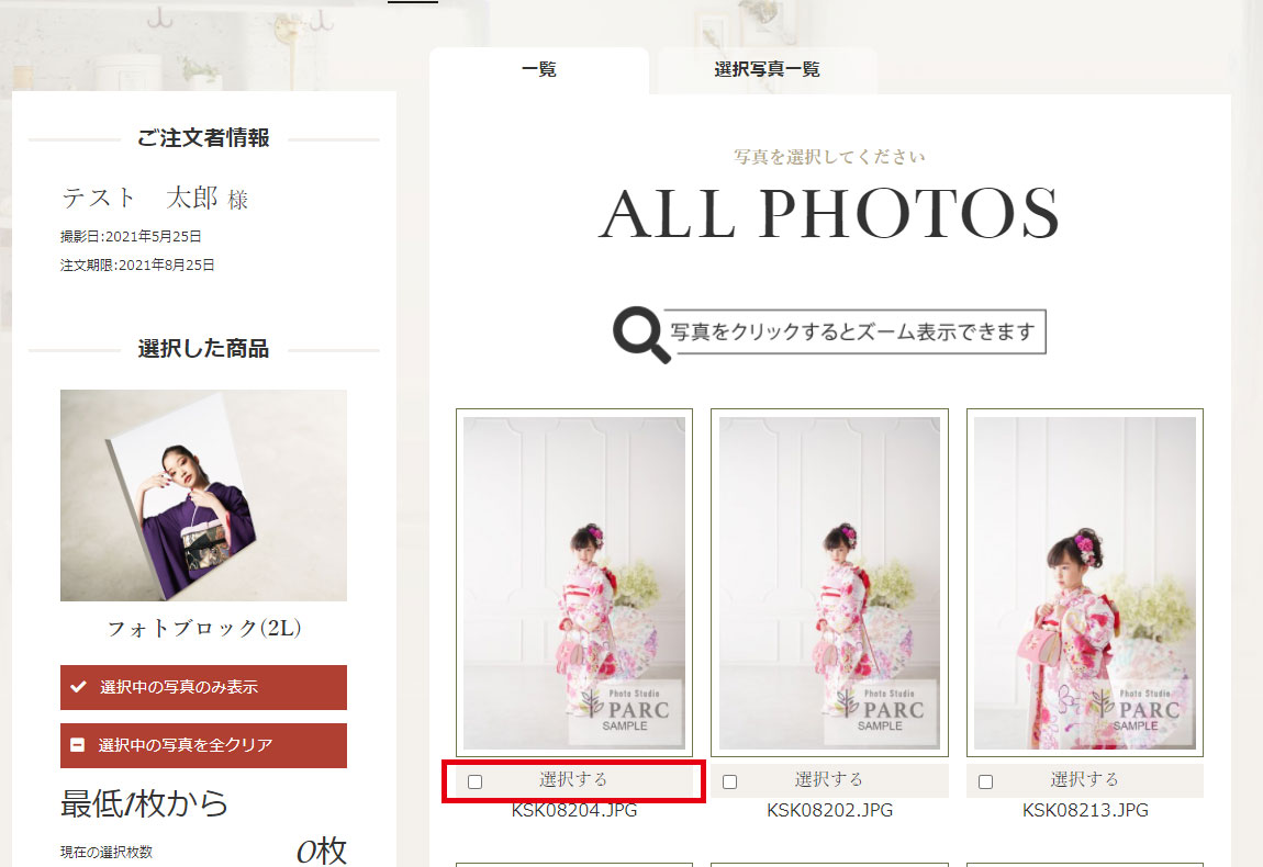 注文する写真の「選択する」をクリックしてください。